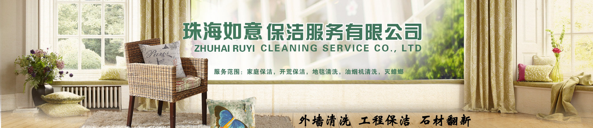 珠海市如意清潔主營(yíng):外墻清洗、地毯清洗、石材護(hù)理翻新、企業(yè)保潔、開(kāi)荒清潔、屋面防水、油煙管道清洗。家庭保潔,物業(yè)保潔,小區(qū)物業(yè)保潔,樓盤(pán)開(kāi)荒,沙發(fā)清潔,地板打蠟,(建筑、汽車(chē)玻璃貼膜)。